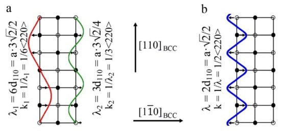 As we approach Ms, the intensity of the streaks along <110>* increases and, most importantly, according to qualitative and quantitative assessment, the intensity of the extra-reflections (or satellites) in the positions of r.l., close to 1/2<110>*, 1/3<110>* and 1/6<110>* (Figure 11 and Figure 13) should exhibit intensification. The same is valid for the streaks along <112>*, namely, the intensity of the extra-reflections (or satellites) in the positions of r.l., close to 1/2 <112>* and 1/3<112>* must also display an increase. At the satellites-forming stage of the long-period modulation of the crystal lattice, several lattice waves of atomic displacements are distinguished, described by wave vectors ± k, with their polarization vectors ek. In accordance with the experimental data, the following modes of atomic displacements have been established: (i) transverse wave with k = 1/2<110>*, its ek is parallel to <10>; (ii) transverse wave with k1 = 1/6<110>*, its ek is parallel to <10>; (iii) transverse wave with k2 = 1/3<110>*, its ek is parallel to <10> [52]. A transverse wave with k = 1/3<112>* is a superposition of two waves: the first one with k equal to <1/3 1/3 0>* and the second one with k equal to <1/3 0 1/3>* (generating satellites of the type 1/3<211>* in the diffraction pattern).