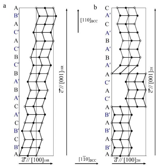 Schemes of crystal lattice rearrangement of martensite: (a) D03→18R and (b) D03→2H [62].