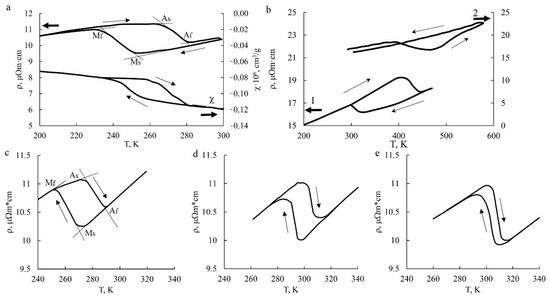 (a) Temperature dependences ρ(T) and χ(T) of the Cu–14Al–3Ni alloy after quenching from 1223 K into water upon thermal cycling: cooling from RT to 90 K—heating to RT. (b) Temperature dependences of ρ(T) of the Cu-14Al-3Ni alloy after HPT in the measurement cycles 300 K →LN →470 K →300 K (curve 1) and 300 K →573 K →300 K (curve 2) (LN is an abbr. for liquid nitrogen). (c–e) Temperature dependences ρ(T) of the Cu-14Al-4Ni alloy after (c) quenching, (d) MPC at 973 K, and (e) MPC at 773 K. The thin arrows show the cycles of heating and cooling during the experiment [62].
