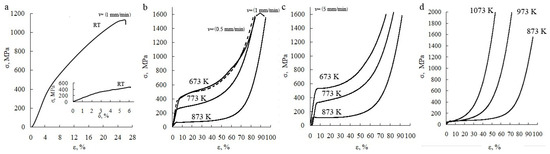 «Stress–strain» (MPa) curves for the Cu–14Al–4Ni alloy under compression tests at a rate of (a,b,d) 1 mm/min (continuous line), (b) 0.5 mm/min (dashed line), and (c) 5 mm/min, at various temperatures (RT, 673, 773, 873, 973, and 1073 K); (insert in (a)) under subsequent tensile tests at RT alloy quenched at 1223 K [47].