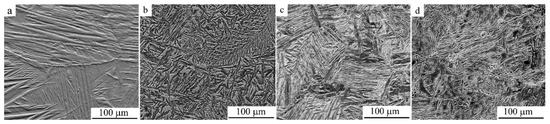 (a) OM image and (b–d) SEM images of the packet martensite microstructure of Cu-14Al-3Ni alloy after repeated quenching from 1273 K, 30 min. The arrows show the placement of enlarged fragments (b,d) [46].