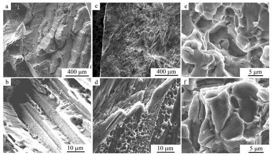 Figure 19a,b shows a SEM image of the martensitic microstructure of the alloy after tensile and compression tests at RT. As can be seen after MPC compared to the tense test, the morphology has changed and the crystals of martensite in the dominant packet morphology have been significantly refined in size. Virtually no large arc-shaped joints were detected, and the sizes of both individual martensite crystals and their packets significantly decreased. Figure 20a–f shows typical images of the fracture surface obtained by fractographic analysis of samples after tensile or compression tests. The brittle and the tough-brittle, both intergranular and intragranular, fracture of the alloy in the martensitic state after tensile tests at RT occurred mainly along the boundaries of packets of twin-oriented martensite crystals (Figure 20a,b). The fracture during MPC of the alloy with the formation of small-dimple fracture sites indicates the predominance of a tough-ductile fracture mechanism at RT (Figure 20c,d).
