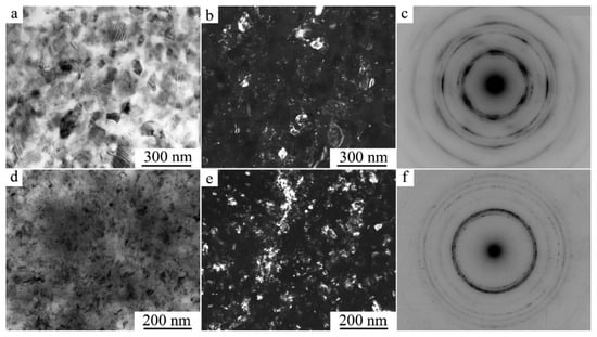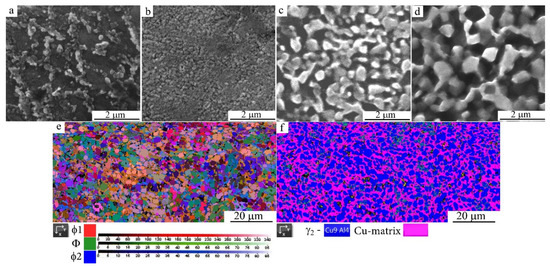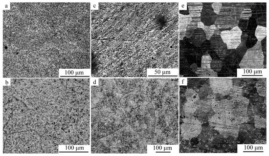 (a–d) SEM images in SE mode and (e,f) OM images of the FG structure in the Cu-14Al-4Ni alloy after the compression tests at (a–c) 673 K ((a)—v = 5, (b)—v = 1, (c)—v = 0.5 mm/min), (d) 873 K (v = 5 mm/min), (e) 973 K (v = 1 mm/min), and (f) 1073 K (v = 1 mm/min) [47].