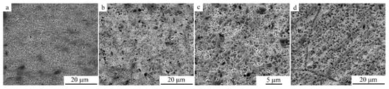 SEM images in SE mode of the intragrain microstructure in the Cu-14Al-4Ni alloy after the compression tests at 673 K ((a)—v = 5, (b,c)—v = 1, (d)—v = 0.5 mm/min) [47].