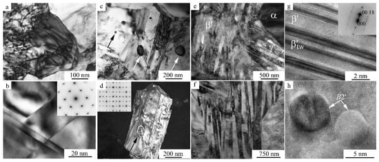 (a,c,e,f) Bright- and (b,d) dark-field TEM images (amplitude contrast) and (g,h) high-resolution TEM images (phase contrast) of the microstructure of the (a,b) α, (c,d) γ2 and B2′ phases, (e–g) martensites and (h) B2′ phase particles after compression tests at (a–d) 773 K and (e,g) 873 K, (f) 973 K, and (h) 673 K [51,53].