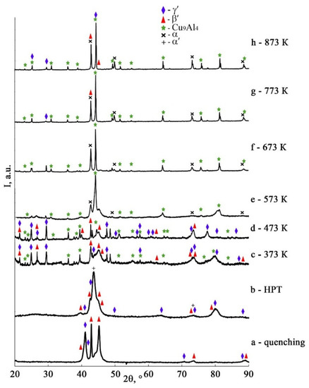 - Svirid, A.E.; Pushin, V.G.; Kuranova, N.N.; Makarov, V.V.; Uksusnikov, A.N. The Effect of Heat Treatment on the Structure and Mechanical Properties of Nanocrystalline Cu–14Al–3Ni Alloy Prepared by High-Pressure Torsion. Phys. Met. Metallogr. 2021, 122, 883–890. [Google Scholar] [CrossRef]