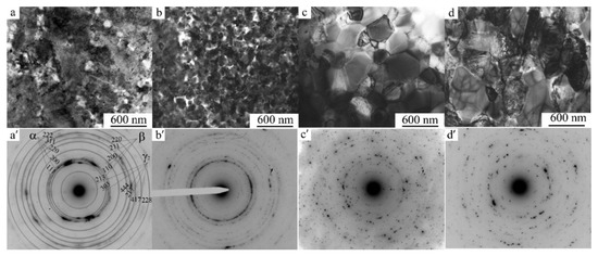 Thus, firstly, it was found that a dynamic recrystallization process took place in the alloy at hot MPC, as a result of which an austenite FG structure homogeneous in grain size was formed. This FG structure was significantly (by an order of magnitude) more disperse than in the original prototype alloy. Secondly, during compression at 873 K and in the less extent at 973 and 1073 K, partial pro-eutectoid decomposition was induced in austenite with heterogeneous and homogeneous precipitation of the γ2 phase, the size of which increased with increasing compression duration, whereas at 673 and 773 K (i.e., below TED), along with the γ2 phase, the α and B2′ phase particles were precipitated. Their boundaries as the places of predominant heterogeneous nucleation subsequently turned out to be decorated with the phases that underwent precipitation, since the size refinement of austenitic grains occurred as a result of dynamic recrystallization, which preceded the decomposition. As is known, the barrier effect of grain boundary precipitations can restrain the growth of grains with continuing hot deformation. Austenite after MPC, when cooled to RT, experienced a TMT with the formation of the β’ and γ’ martensitic phases of packet morphology.