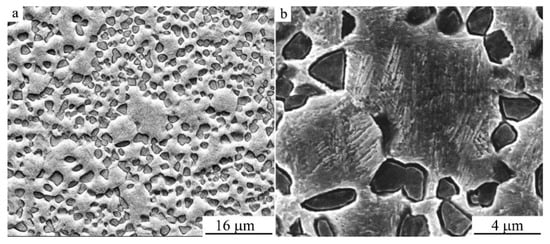 As was already noted, the fracture of the initial hot-forged quenched CG alloy occurred in brittle mode, mainly by cleavage along the grain boundaries and large packets of martensitic crystals (see Figure 6a). The nano-scale grain–subgrain structure after an HPT of 10 turns changed the type of fracture and the nature of the fracture of the samples [46]. Fractography has shown many centers of localization of deformation with the formation of small flat dimples and, accordingly, low ridges of separation, which is characteristic of the tough-ductile intragrain fracture mechanism operating alloys. However, the average size of the dimples was 2–5 µm, which was two orders of magnitude larger than the size of the elements of the UFG structure of the HPT alloys. This circumstance indicates a special inter-crystalline mechanism of their fracture, obviously along the large-angle boundaries of the UFG structure. At the same time, the size of cellular fragments (dimples) of separation during tough-brittle fracture became two orders of magnitude smaller compared to the size of grains and areas of brittle cleavage in the prototype CG alloy. This ultimately determined, in a number of cases, the increased ductility of the UFG alloys previously subjected to HPT.