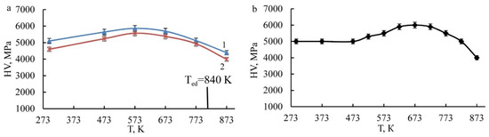 Figure 26a presents the results of subsequent tests of the mechanical properties of the alloy already in the metastable austenitic state during tensile tests at RT. The properties of the FG alloy samples were measured after MPC at 973 and 1073 K to compare them with the properties of the CG alloy in its initial state after forging at 1223 K and quenching (see insert in Figure 18a). A unique feature of the mechanical behavior of this FG alloy under tension after compression was the presence of a stage of martensitic inelastic pseudo-yield (εm 4%) at a low starting stress of the reorientation of the twin martensitic structure in the direction of the acting tensile force (σm < 100 MPa). Then, a strong deformation hardening occurred, culminating in the fracture of the samples at high values of σu after significant plastic deformation for these alloys (δf = 14–16%) (see Figure 26a). The curve in the insert in Figure 18a illustrates, on the contrary, the low strength and plastic properties of a conventional hardened CG alloy.