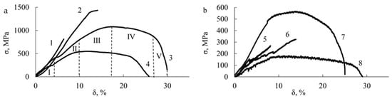 «Stress–strain» (MPa) tensile curves of the Cu–14Al–3Ni alloy after HPT to 10 revolutions, at (a) ~ 1 × 10–3 1/s and temperatures of (1) 300, (2) 423, (3) 573, (4) 673 K; and at (b) v ~ 10–4 1/s and (5) 423, (6) 473, (7) 573, and (8) 673 K. I–V are the stages of deformation [65].