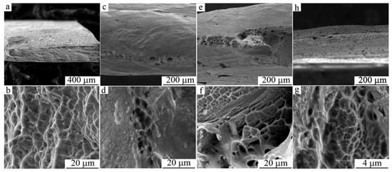 SEM images (different magnifications) of fracture surfaces of the Cu–14Al–3Ni alloy after tension at v = 10–4 1/s and various temperatures: (a,b) 423, (c,d) 473, (e,f) 573, and (g,h) 673 K [65].