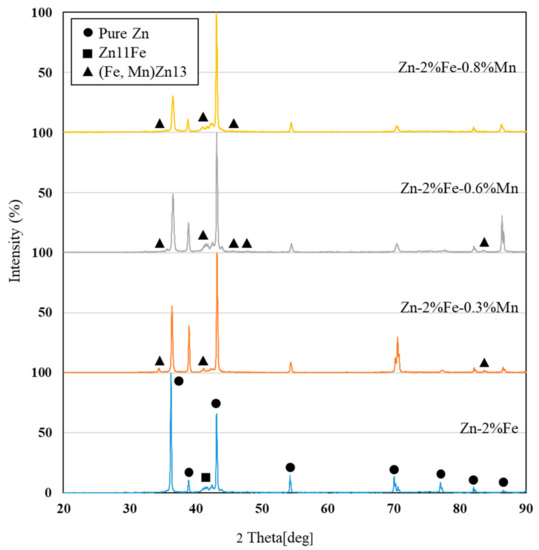Phase identification by XRD analysis of Zn-2%Fe alloys with up to 0.8% Mn revealed the presence of three dominating phases: Pure Zn, Fe-rich phase and Mn-rich phase as shown in Figure 1. The Fe-rich phase was identified as Zn11Fe, and the Mn-rich phase was classified as (Fe,Mn)Zn13 [39,48].