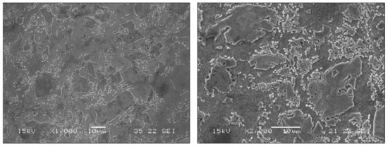 The microstructure of the tested alloys was evaluated after polishing and etching in 5% Nital solution that was composed of 5 mL HNO3 and 100 mL ethanol. The microscopic characterization was performed using a scanning electron microscopy (SEM), JEOL JSM-5600 (JEOL, Tokyo, Japan) combined with energy-dispersive X-ray spectroscopy (EDS, -Thermo Fisher Scientific, Waltham, MA, USA) for spot chemical analysis. The identification of phases was carried out using X-ray diffraction (XRD) analysis (RIGAKU-2100H, Tokyo, Japan) with Cu-Kα at 40 kV and 30 mA, and the scanning rate was 0.02°/min.