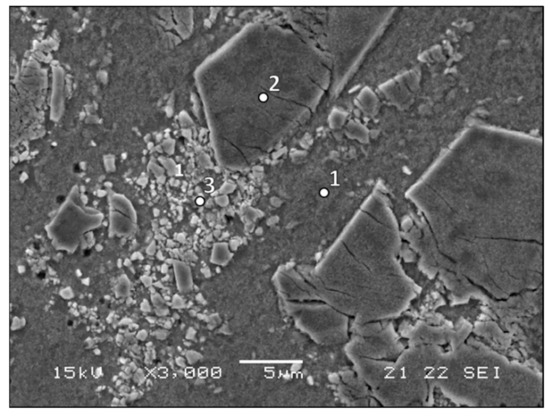 Spot chemical composition by SEM-EDS analysis (wt.%) of different areas shown in Figure 5.