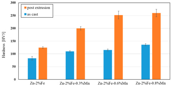 Hadrness measurement of Zn-2%Fe alloy with Mn additions in as-cast and post extrusion conditions.