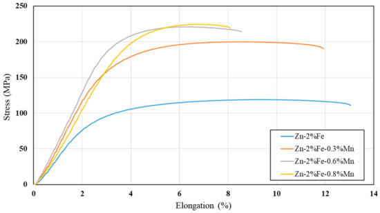 - Additions of up to 0.8% Mn to biodegradable Zn-2%Fe alloy resulted in increased hardness and tensile strength in terms of yield point and ultimate tensile strength, while slightly reducing ductility. The main mechanism of strength enhancement was solution strengthening that was amplified by the precipitation hardening of a secondary phase (Fe, Mn)Zn13.