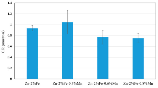 Corrosion rate measurements of Zn-2%Fe with up to 0.8% Mn after immersion test in PBS solution for 14 days.