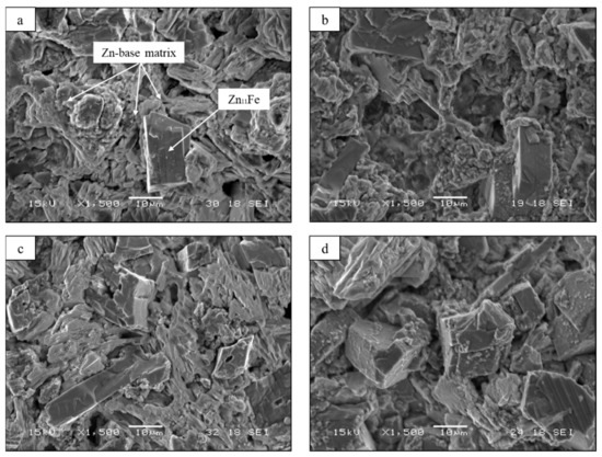 Figure 4 and Table 2 present the EDS analysis that was conducted for three main areas: Zn base matrix, Zn11Fe and (Fe, Mn)Zn13.