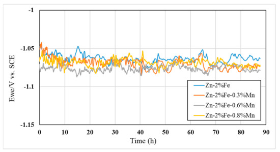 Measurements of the open circuit potential (OCP) of the tested alloys, immersed in PBS solution for up to 90 h, is presented in Figure 9. The OCP of all tested alloys was within the range of −1.04 V and −1.09 V, with an arbitrary effect of Mn addition. This, in practice, means that the effect of Mn on OCP was insignificant, as indicated by the immersion tests.