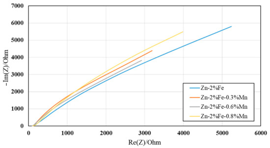 Potentiodynamic polarization analyses are shown in Figure 10 and Table 4. These reveal that the nature of the polarization curves due to the additions of Mn to the base alloy is quite uniform. Furthermore, the corrosion potential and corrosion rate measurements of the tested alloys in terms of Tafel extrapolation were also relatively similar. The results of the potentiodynamic polarization analysis basically come in line with the impedance spectroscopy (EIS) evaluation in terms of the Nyquist diagram, as shown in Figure 11. According to this evaluation, the magnitude of the radii of curvature of the tested alloys was quite similar. As the radii of curvature essentially represent the surface corrosion resistance, it is again evident that the effect of Mn on the corrosion resistance of the base Zn-2%Fe alloy was relatively minor.