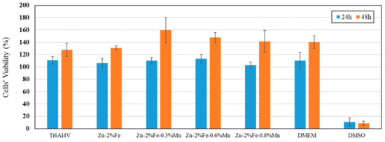 Cytotoxicity examination of the tested alloys carried out by indirect cell viability analysis using Ti-6%Al-4%V as a reference alloy, and incubation periods of 24 h and 48 h are shown in Figure 12. This reveals that the cell viability of all the tested alloys was clearly above 95% and 120% after 24 and 48 h of incubation, respectively. In fact, this result comes in line with the requirements mentioned by ISO 10993-5 [50], which indicate that adequate cell viability should be above 70% to prevent negative cytotoxic effects. As for the influence of Mn additions to the base Zn-2%Fe alloy, the addition of up to 0.8% Mn has some relative beneficial effect on cell viability, especially for the longer incubation time. The above quantitative results are also supported by the general appearance and healthy conditions of the 4T1 cells after 48 h incubation, as shown in Figure 13.