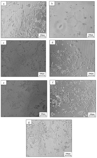 General view of 4T1 cells after 48h of incubation: (a) DMEM only; (b) DMEM+DMSO; (c) TI6Al4V; (d) Zn-2%Fe; (e) Zn-2%Fe-0.3%Mn; (f) Zn-2%Fe-0.6%Mn; (g) Zn-2%Fe-0.8%Mn.