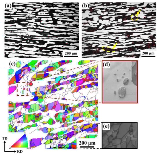 The microstructures of samples were characterized using electron backscattered diffraction (EBSD, FEI Quanta 650, FEI Company, Hillsboro, OR, USA), with 1 μm step size and 20 mm working distance at 20 kV. The specimen preparation was described elsewhere []. A transmission electron microscope (TEM, FEI Tecnai G2 F20, FEI Company, Hillsboro, OR, USA) was used for the microstructural and elemental examination. The TEM specimens were prepared by referring to the existing article []. The element contents of each phase were detected by the electron probe X-ray microanalysis (EPMA) in model JXA-8530F (JEOL Ltd., Tokyo, Japan). Three test points were randomly selected from the same phase and the average value was calculated. The corrosion pits were observed with an optical microscope (OM, Leica MEF4M, Leica, Wetzlar, Germany) and a scanning electron microscope (SEM, FEI Quanta 650, FEI Company, Hillsboro, OR, USA). A thermal scanning electron microscope (CSLM, Coherent Inc., Santa Clara, CA, USA) was used to measure the depth of pits.