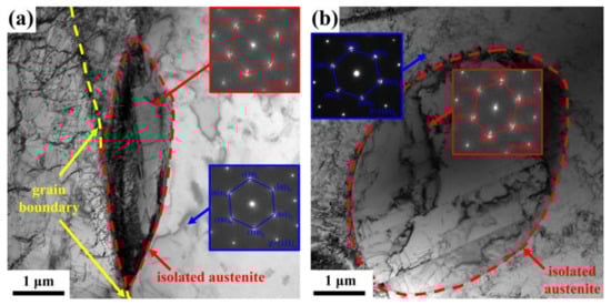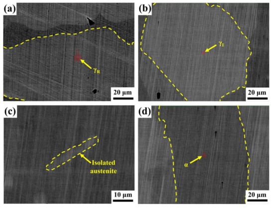S32750 duplex stainless steel (DSS) contains approximately equal proportions of ferrite (α) and austenite (γ) and has superior integration of advanced mechanical properties with excellent corrosion resistance [,]. The pitting resistance equivalent number (PREN) is greater than 40 due to its high mass fraction of Cr (25–27%) and Mo (3–4.5%), and medium mass fraction of N (0.24–0.32%), especially the local pitting resistance in high-chloride environments, which brings wide applications to the marine and petrochemical industries. Undesired secondary phases such as M23C6, M7C3, Cr2N, σ-phase and χ-phase formed in S32750 severely deteriorate the pitting resistance []. The secondary phases above have been studied thoroughly and could be well-avoided in the production process. However, different from the pancake-like austenite, the tiny-sized dispersed spherical austenite is often observed in the water-cooling process after hot rolling, which is named “isolated austenite (IA)” through its morphological character. As a metastable structure, the appearance of IA is speculated to bring several problems to the production and development of DSS, while its formation and influence on properties remain ambiguous.