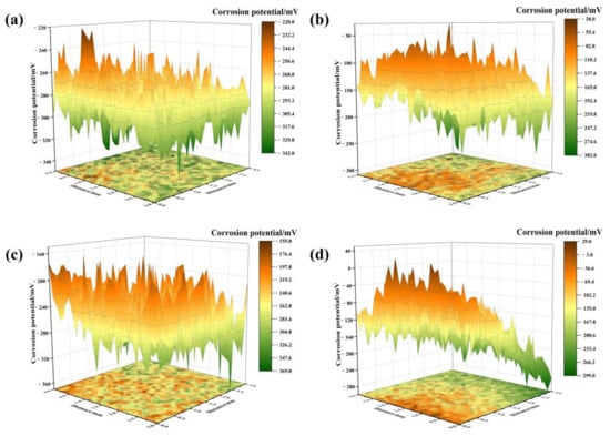 When corroded for 12 h, the surface potential distribution of state R is uniform (Figure 4a) with no obvious cathode and anode partition in the 2Dmapping. Exhibiting negative initial potential, its highly concentrated surface potential is basically distributed around −287.14 mV. The potential range is −342 mV~−220 mV and the potential difference (ΔE) is 122 mV. For the 12 h-immersed sample in state I, the surface potential disperses slightly with potentials ranging from −369 mV~−155 mV and ΔE 214 mV. Compared with state R, although the anode distribution increases, the anode/cathode distribution still performs apparent randomness in general. After being immersed for 24 h in state R, the positively shifted corrosion potential dispersedly distributes ranging from −302 mV to −28 mV, resulting in the ΔE increase to 274 mV. Meanwhile, the anode and cathode areas appear apparently. The surface potential moves more positively, and the distribution displays further dispersion in state I. An obvious potential peak is observed in the anode area, and the ΔE is 328 mV. Accordingly, the corrosion degree rises significantly after conducting for 24 h.