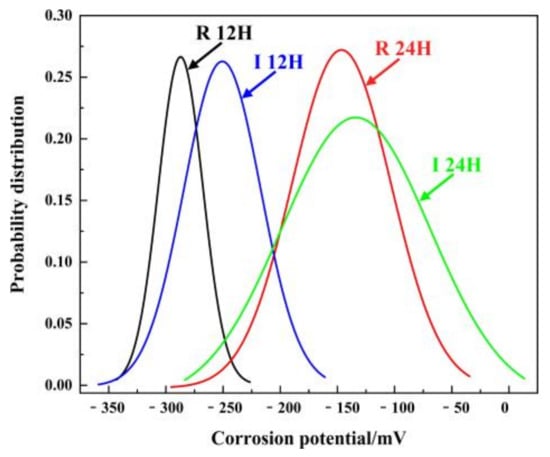 The Kelvin potential distribution of state R and state I immersed in 6%FeCl3 + 5%HCl solution for 12 h and 24 h are displayed in Figure 4. The Gaussian distribution function (Equation (2)) was adopted to fit the potential distribution above. The fitting results are listed in Figure 5 and Table 2.
