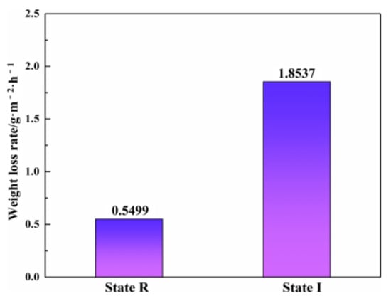 where V− is the corrosion weight loss rate; W0 is the initial mass of sample; W1 is the mass after corrosion products removed; S is the surface area of sample exposed in corrosive solution; and t is corrosion time. It can be inferred from Figure 6 that the corrosion weight loss rate of state I is about three times higher than that of state R, which means the pitting corrosion resistance of state I is much lower than state R in the same conditions.