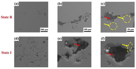 The negligible corrosion pits in state R are observed distributing spherically on the surface of samples (Figure 7a). As indicated by the red arrow in Figure 7c, the pits are open-type with an inner diameter less than the orifice diameter. Corrosion cracks emerge around the pits (yellow circle in Figure 7c), which indicates that the “bifurcation” expansion forms along a specific interface, for instance, grain boundaries or phase boundaries. In state I, the number of the corrosion pits increase (Figure 7d). There are evident peeling marks on the surface (Figure 7e). The morphologies of pits change from open-type to narrow-type, presenting a tiny outlet with a large cavity structure (Figure 7f). Corrosion develops to the inner areas of the sample, indicating that the dissolution rate inside the pits is greater than that of the surface. Similar to state R, a “bifurcation” corrosion gap still appears around the pits.