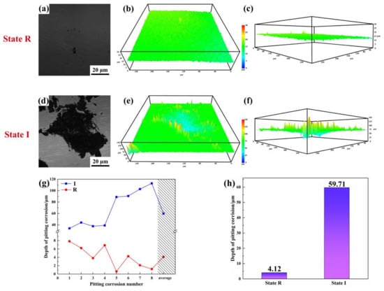 Three-dimensional morphologies of the corrosion pits in state R (a–c) and state I (d–f) and depth of corrosion pits (g,h).