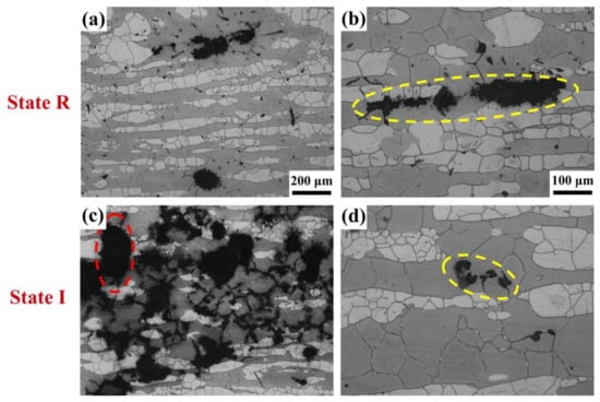 Analyzing metallographs of state R, the corrosion pits mostly initiate at α grain boundaries (Figure 9a) and α/γ phase boundaries (Figure 9b), part of which arrange neatly along phase boundaries and spread into α (as shown in the yellow circle). In state I, the initiation sites of the corrosion pits remain the same. Nevertheless, the pits formed at α/γ phase boundaries expand or even cover γ entirely (as shown in the red circle). In addition, rosary-liked pits are found initiated around IA that have precipitated at α grain boundaries (Figure 9d), while the IA itself is hardly eroded. It is also observed in Figure 9d that no pits arise around the IA in the internal α grains. Therefore, the occurrence of corrosion pits is also related to the location of IA.
