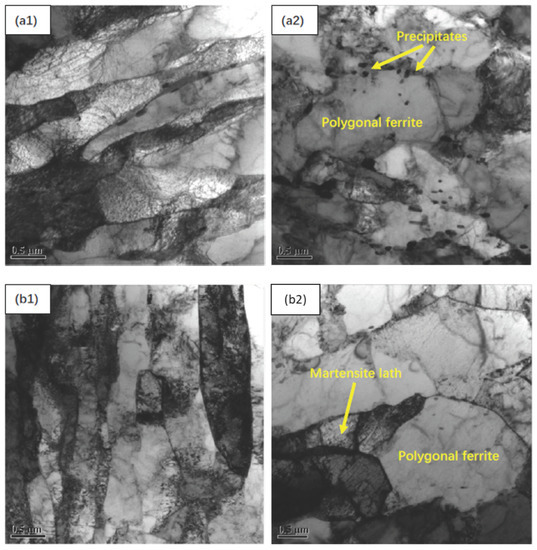 The TEM images of the weld zone and base metal after creep fractures for different stress levels are shown in Figure 10. The sample of base metal for TEM observation was taken from the creep sample near the fracture, while that of weld zone was taken from the center line of the joint. The left side of Figure 10 denotes the base metal, while the right side represents the weld zone. The base metal exhibits the typical morphology of lath martensite, whereas the weld zone shows the microstructure of polygonal ferrite.