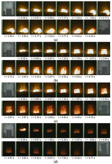 SHS combustion wave propagation sequences recorded from test samples of (a) Fe-25% Si, (b) Fe-40% Si, (c) Fe-50% Si, and (d) Fe-66.7% Si.