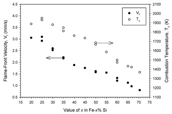 Variations of flame-front velocity (Vf) and combustion temperature (Tc) with Si percentage of Fe-x% Si of sample compacts.