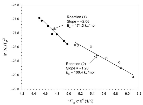 where λ is the thermal conductivity, ρ the density, R the gas constant, Q the heat of reaction, Tc the combustion front temperature, and ko the Arrhenius rate constant. According to Equation (8), Ea can be obtained from the slope of a best-fitted linear line correlating ln(Vf/Tc)2 with 1/Tc.