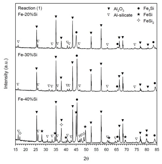 Figure 4 presents XRD patterns of the products of Reaction (1) with Fe-20%, Fe-30%, and Fe-40% Si. As revealed in Figure 4, Fe3Si is the only silicide formed from Reaction (1) with Fe-20% and Fe-30% Si. This agrees with the homogeneity range of Fe3Si in the phase diagram. In the product of Reaction (1) with Fe-40% Si, silicide compounds comprising the three different phases of Fe3Si, FeSi, and FeSi2 were identified with Fe3Si and FeSi being two primary phases. This reflects the fact that Fe3Si and FeSi are co-existent under stoichiometry from Fe-30% to Fe-50% Si. In addition to silicide compounds, Figure 4 points out the formation of Al2O3 from the aluminothermic reduction of Fe2O3 and the presence of a small quantity of aluminum silicate that was formed through the dissolution of Si into Al2O3 during the SHS process [33].