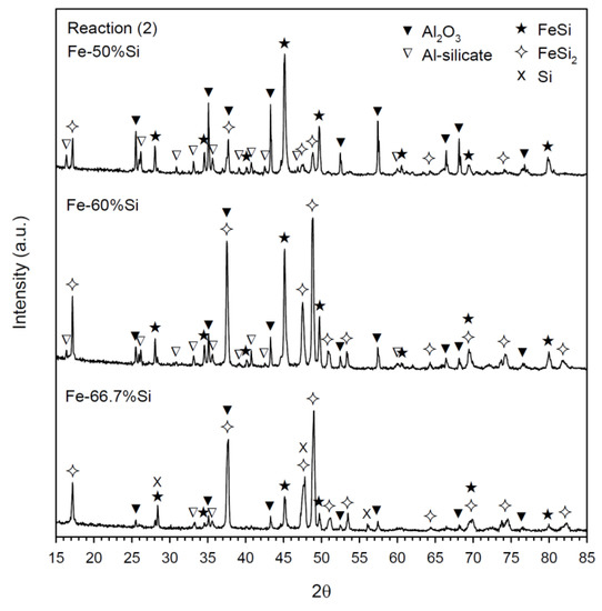 As also indicated in Figure 6, the resulting silicides of Reaction (2) with Fe-50% and Fe-55% Si were dominated by FeSi with a yield percentage up to 92.9% and 84.5%, respectively, and FeSi2 was the minor phase. With the increase of Si, comparable amounts of FeSi and FeSi2 were produced from the reactions of Fe-60% and Fe-65% Si. Finally, FeSi2 became the governing phase with high yield percentages of 79.1% and 87.4% in the products of samples with Fe-66.7% and Fe-70.5% Si, respectively. For Reaction (2) with Si from Fe-50% and Fe-70.5% Si, the change in dominant silicide from FeSi to FeSi2 was observed.