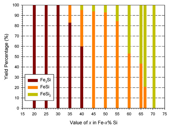 Yield percentages of iron silicides (Fe3Si, FeSi, and FeSi2) from samples with different Si percentages in Fe-x% Si.