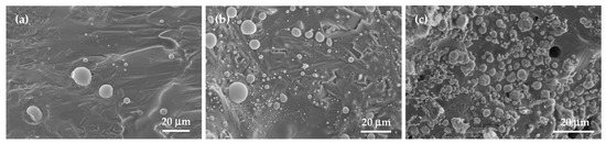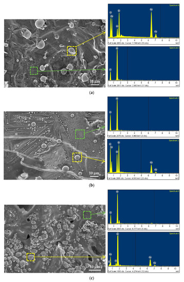 SEM images presented in Figure 8a–c are associated with the final composites produced from samples of Fe-20%, Fe-55%, and Fe-66.7% Si, respectively. It is evident that granular particles revealed in Figure 8a,b are more spherical than those in Figure 8c. The silicide grains formed were Fe3Si in Figure 8a and mostly FeSi in Figure 8b. Their particle size ranged from submicron to about 10 μm. The matrix made up of Al2O3 in both Figure 8a,b is dense and continuous. Figure 8c shows that FeSi2 granules with a size of 2–5 μm are formed over the Al2O3 substrate. Some pores were observed in the matrix due to volume expansion of the product. A comparison between Figure 7 and Figure 8 pointed out that similar microscopic structures of the final composites were observed as their initial compositions had close Fe/Si proportions.