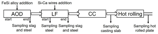 | LF | without calcium addition | calcium addition 2 m/t before weak stirring | modify high-melting-temperature inclusions |