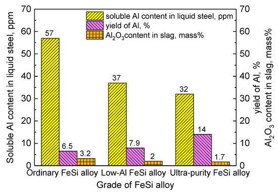 - With the increase of aluminum content in FeSi alloy, the contents of soluble aluminum in molten steel and Al2O3 in slag increase. When using ordinary FeSi alloy, the content of soluble aluminum in molten steel becomes higher than 0.005 mass%. The content of soluble aluminum in liquid steel could be limited to lower than 0.004 mass% when using ultra-purity FeSi alloy at the reduction stage of AOD.