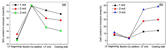 - After feeding Si-Ca wires in LF refining process, where utilize the low basicity of slag, the contents of SiO2, Al2O3 and CaO in the inclusions are reduced in varying degrees. When the feeding amount of calcium wire is 2 m/t, the content of CaO of inclusions in the casting billet is around 25%, and the melting point of inclusions enter the region of low melting point.