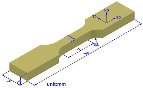 Room temperature tensile tests were performed with a CMT5105 electronic universal testing machine(Tianjin, China) with a loading rate of 0.5 mm/s. Tensile test specimens are dog-bone-shaped with a gauge size of 2 mm × 2 mm × 7 mm, as shown in Figure 1. At least 3 samples were tested for each alloy state to render reliable results. For ECAP alloys, the tensile direction is along ED. Microstructures of specimens were characterized by X-ray diffraction (XRD, Bruker D8 DISCOVER, Bruker, MA, USA), optical microscopy (OM, Olympus BX51M, Olympus, Tokyo, Japan), and scanning electron microscopy (SEM, ZEISS G300, Zeiss, Oberkochen, Germany) equipped with electron backscatter diffractions system (EBSD) and energy dispersive spectroscopy (EDS). OM, SEM, and EBSD specimens were prepared following the procedure described in []. The average size and area fraction of particles in ECAP alloys were obtained with the Image-Pro Plus. EBSD data were post-processed with the Channel 5 software. All EBSD results presented in this work were obtained by using this software.