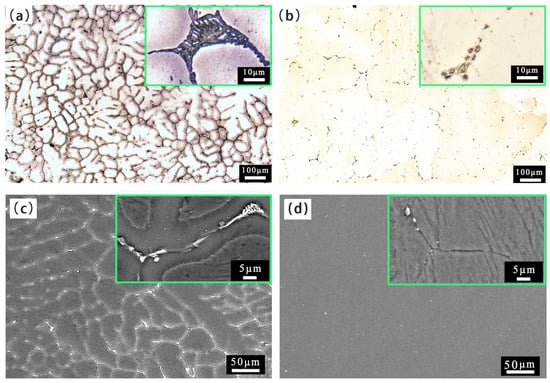 OM (a,b) and SEM (c,d) images of as-cast (a,c) and solid-solution-treated (b,d) Mg–5Sn alloys. Insets are high-resolution images showing the intermetallic phase.
