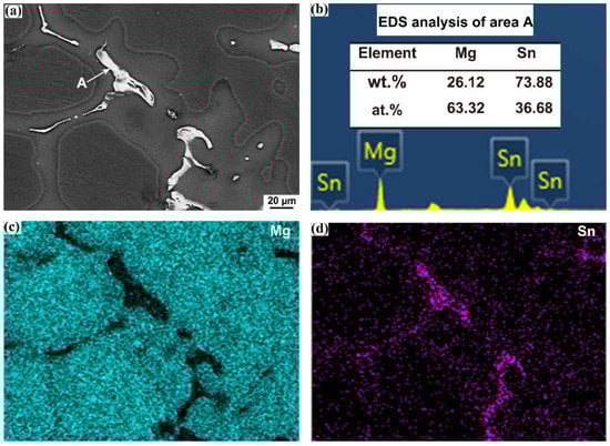(a) SEM image showing intermetallic particles in the as-cast Mg–5Sn alloy, (b) EDS analysis of area A, and (c,d) EDS mapping of the region shown in (a).