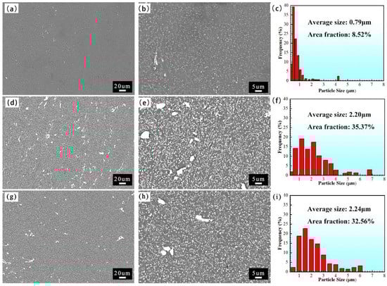 SEM images of (a,b) ECAP 4P alloy, (d,e) ECAP 8P alloy, and (g,h) ECAP 12P alloy. Statistics of Mg2Sn particles in (c) ECAP 4P alloy, (f) ECAP 8P alloy, and (i) ECAP 12P alloy.