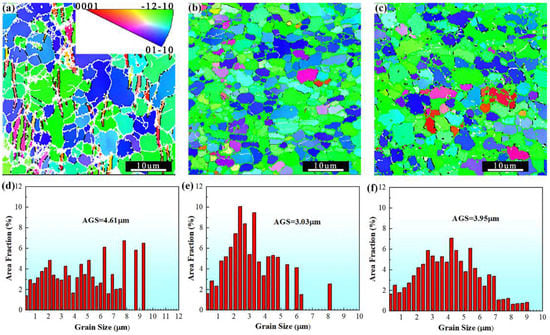 IPF maps of (a) ECAP 4P alloy, (b) ECAP 8P alloy, and (c) ECAP 12P alloy. Statistics of grains in (d) ECAP 4P alloy, (e) ECAP 8P alloy, and (f) ECAP 12P alloy.